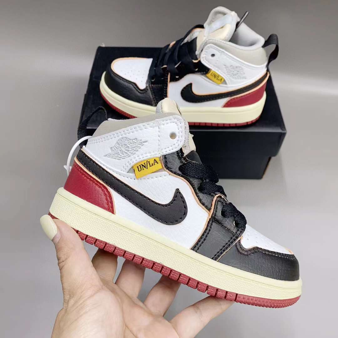 The Nike Air Jordan AJ 1 Sneakers for kids in black combine iconic style with durable construction, perfect for active young athletes. Featuring premium materials and a supportive fit, these sneakers offer comfort and stability during play. Their classic design ensures timeless appeal, making them a versatile choice for both sports and casual wear. Ideal for kids who value performance and style in their footwear.